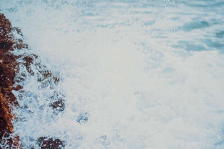 Close-up of sea waves breaking on the rocks of Vilanova y la Geltru beach