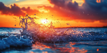 Beautiful sunset over the ocean with waves splashing in close-up. Vibrant colors of red, orange, and blue sky with clouds and water splashing in the foreground. High resolution, sharp focus, and very detailed. --ar 2:1 --v 6.1 Job ID: ffaf2582-f09a-41c5-88e1-55db7b37c226