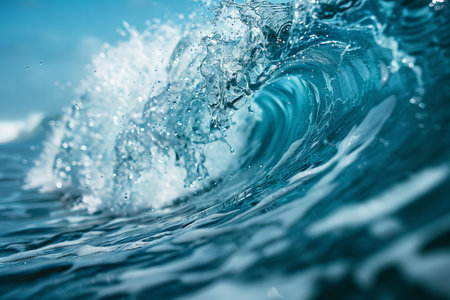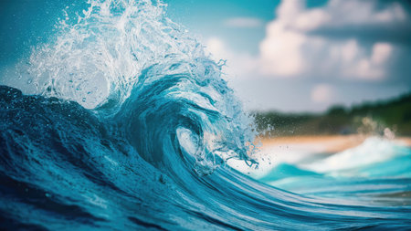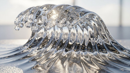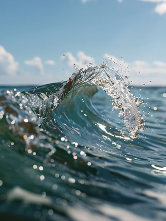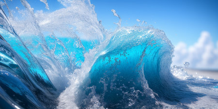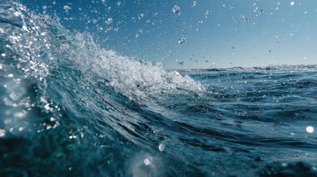 Shimmering showing a close-up view of a transparent, crystal-clear wave with sunlight reflecting off its surface...