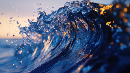 This stunning close-up photography showcases a vibrant blue ocean wave illuminated by soft light reflections during sunset, capturing the dynamic beauty of nature.