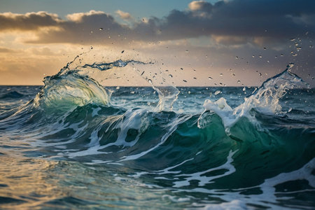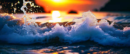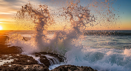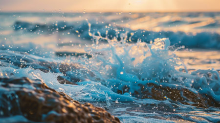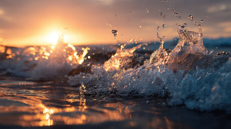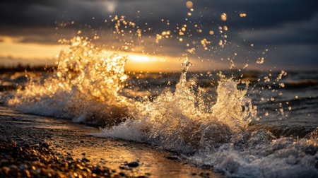 Captivating ocean waves splash against the shore at sunrise, creating a beautiful display of water droplets and golden reflections in a serene landscape.