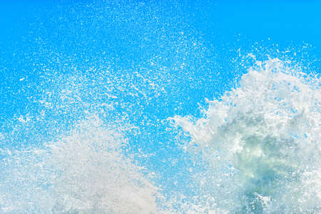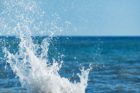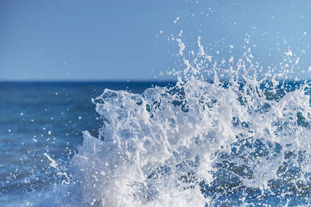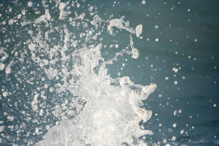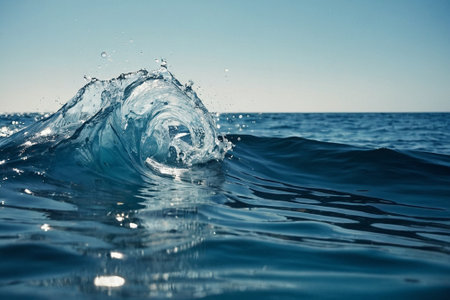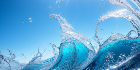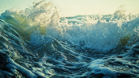 Dynamic ocean wave splashing with crystal-clear water droplets illuminated by natural sunlight.
