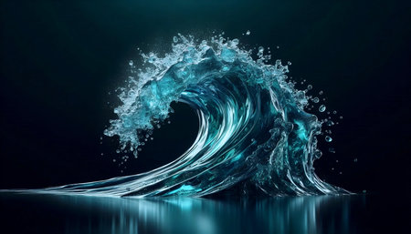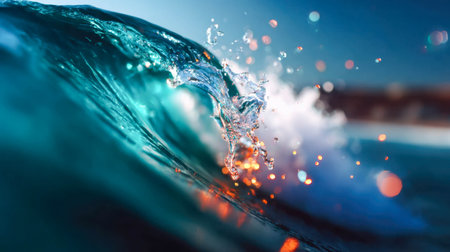 Stunning close-up of a turquoise ocean wave with sparkling splashes, symbolizing nature, energy, and freedom.