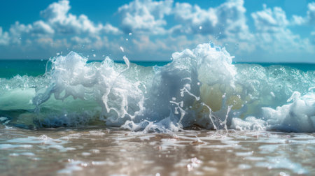 A breathtaking view of a crashing ocean wave adorned with sparkling water droplets under radiant sunlight illuminates the gentle shoreline, creating a serene yet dynamic atmosphere.