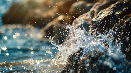 Sunlit waves splashing against rocky shore, creating sparkling droplets