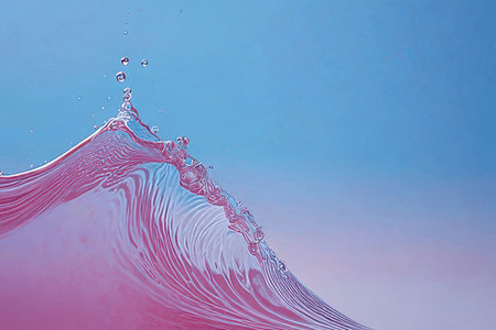 A powerful ocean wave curls gracefully against a pastel gradient backdrop, showcasing shades of pink and blue during sunset.