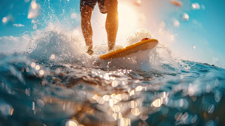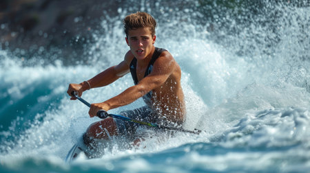 Captivating close-up of a water skier in action, gliding over the water's surface with powerful splashes and reflections creating a dynamic scene.