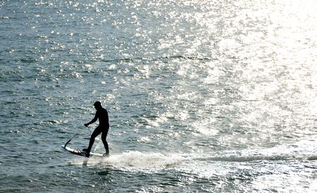 December 28, 2019. Anapa, Russia. Stand Up Paddle surfing on waves. SUP board and surfer in wetsuit in morning