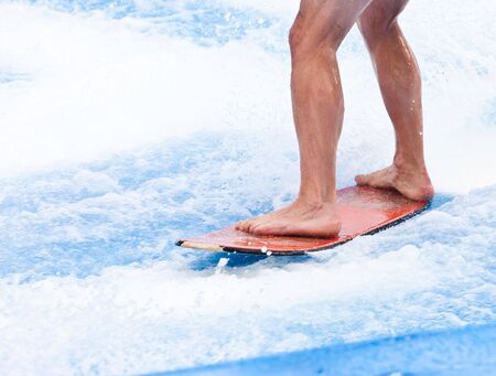 Muscular legs surfing on a red board on blue water