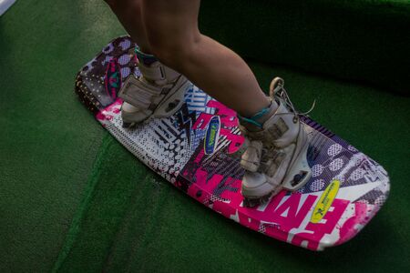 Men's feet on a wakeboard in water.guy sitting by the river and is preparing to go wake boarding