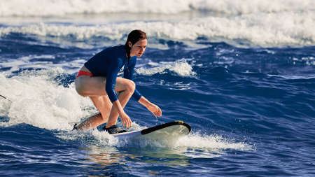 Beautiful young woman learns to stand on a surfboard. Surfer school. Woman in swimsuit in hot summer day. Surfer on the wave. Water sport activity, Atlantic Ocean Dominican Republic. 12/29/2016.