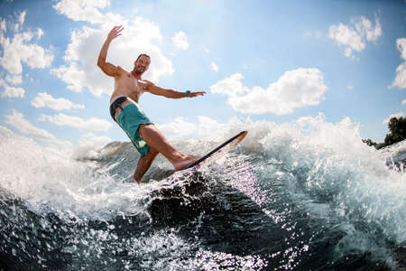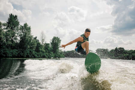 handsome man having fun and jumps at wave on wakesurf board in the summer day.