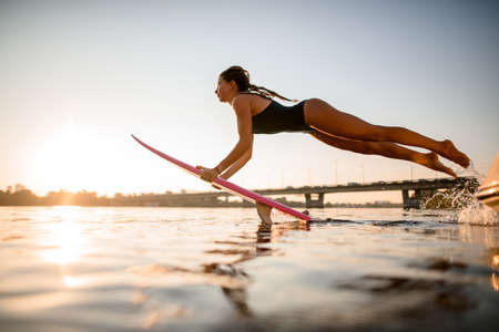 side view of woman with surf style wakeboard in her hands flies over the water