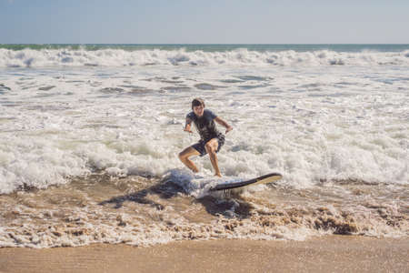 boy has fun surfing in the waves