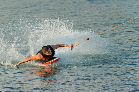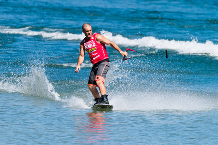 FERREIRA DO ZEZERE, PORTUGAL - SEPTEMBER 19, 2015: Dean Smith (AUS) during the WWA Supra World Wakeboard Championship 2015 in Ferreira do Zezere, Portugal.