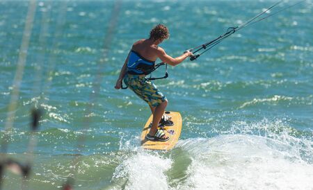 Summer blur background- professional wakeboarding is an extreme water sport. The athlete moves on the board on the water surface with traction, performs the various elements of slalom, jumps, flips.