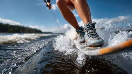 Experience the thrill of water sports in this dynamic image, capturing a close-up of a surfer riding waves on a serene lake under a vibrant blue sky.