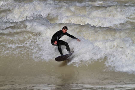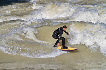 Munich, Germany - October 13, 2021: Surfer in the city river, Munich is famous for people surfing in urban enviroment called Eisbach