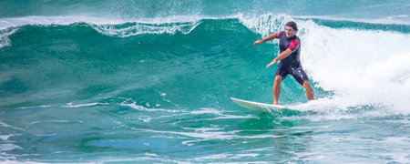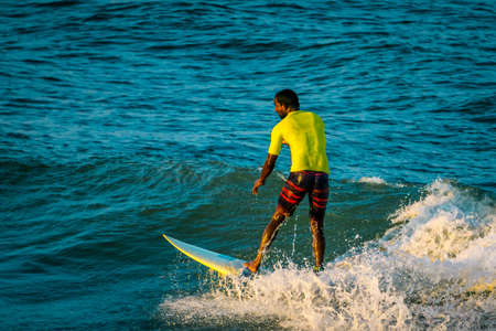 Playa del Carmen, Mexico - May 2, 2023: Person practicing surfing which is a water sport that navigates over the wings with a surfboard. Man standing with balance on a surfboard. Water sports concept.