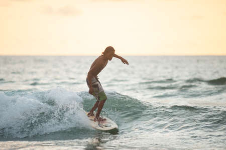 KUANTAN - DECEMBER 29: unidentified surfer in action catching waves in evening at Teluk Cempedak beach on December 29, 2012 in Kuantan, Pahang, Malaysia.
