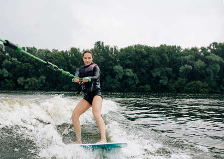 Young woman wakesurfing on river is towed behind a motorboat by wire rope.