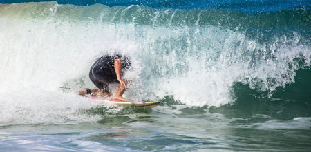 Playa del Carmen, Mexico - March 12, 2023: Surfer surfing the waves of the Caribbean Sea with his small skimboard, an ideal water sport for the beach shore and just like surfing.