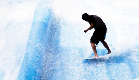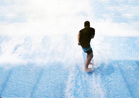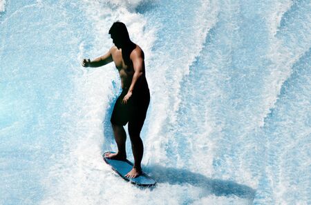 silhouette man shape playing outdoor sport activities artificial water wave surfboard for practice