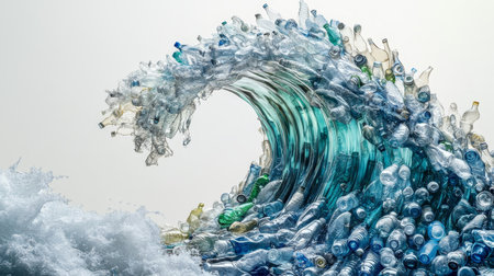 A stunning photorealistic image of a great wave composed of plastic bottles on a white background