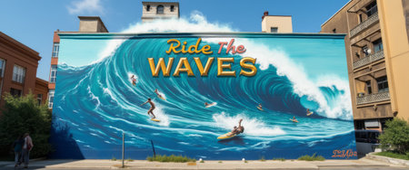A stunning mural captures the thrill of surfing, showcasing vibrant blue waves and surfers skillfully navigating the surf. This artwork invites viewers to embrace adventure and the exhilarating spirit of ocean life.