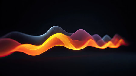 This image features a vibrant, abstract representation of a sound wave. The wave is composed of smooth, flowing lines in a gradient of colors, transitioning from cool blues and purples to warm oranges and yellows. The background is dark, which accentuates the bright, neon colors of the wave, creating a striking visual effect. The image conveys a sense of motion and energy, symbolizing the dynamic nature of sound.