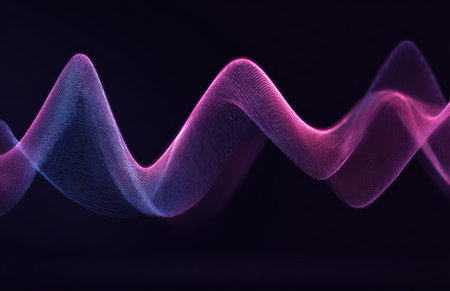 An abstract illustration showcases a waveform in vibrant pink and purple hues against a dark background. The image presents a digital, stylized representation, possibly of sound or data visualization. The composition features a dynamic, curved design and is suitable for various applications related to technology or design.