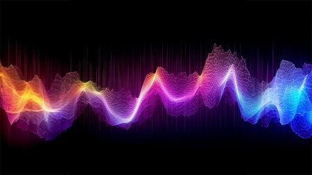 Vibrant abstract sound wave visualization featuring colorful peaks and troughs against a dark background, symbolizing sound frequency and energy. Ideal for technology, science, and multimedia themes.