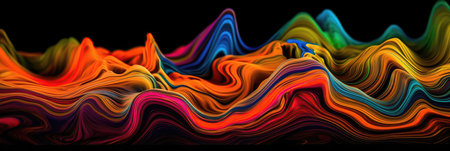 This image presents a vibrant, abstract waveform in multiple colors, with a mirrored reflection effect. The graphic features a three-dimensional appearance with a textured surface. The overall composition is set against a solid black backdrop, suggesting a digital or creative context. Suitable for illustrative purposes, it can be used in various commercial or editorial applications.
