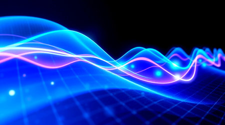 Curved digital waveform graph showing sharp peaks and smooth dips, glowing in a sci-fi blue hue.
