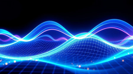 Dynamic, glowing blue neon lines form abstract sound wave patterns, creating a sense of energy and digital motion against a dark background.