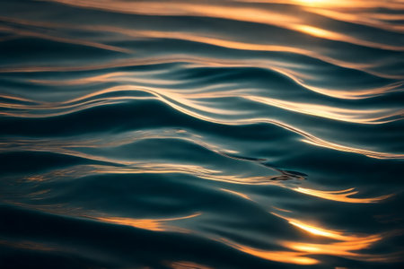 Captivating scene of a calm water surface featuring gentle waves reflecting golden sunset light. Ideal backdrop for nature and tranquility themes.