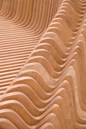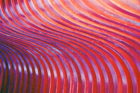 Curved wooden slats. Beautiful gradient from burgundy to crimson. wood texture. abstract background. building facade element.