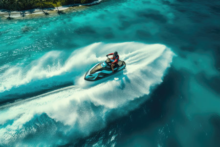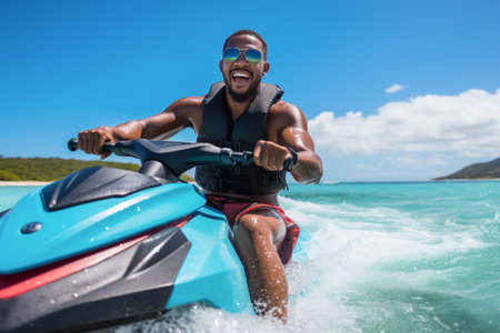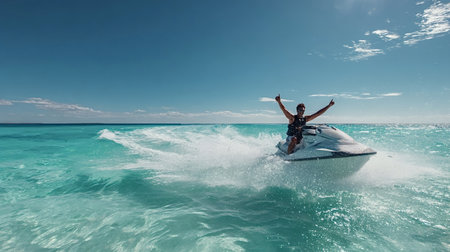 Man riding a jet ski on the bright turquoise ocean, feeling excitement and freedom during a tropical vacation and enjoying extreme water sports under a clear blue sky