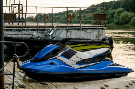 empty jet ski and motor boat on water, sunlight effect
