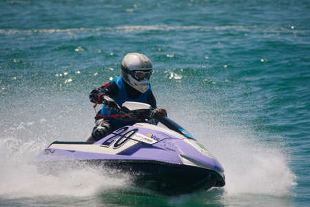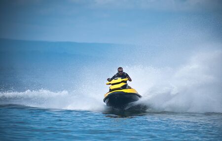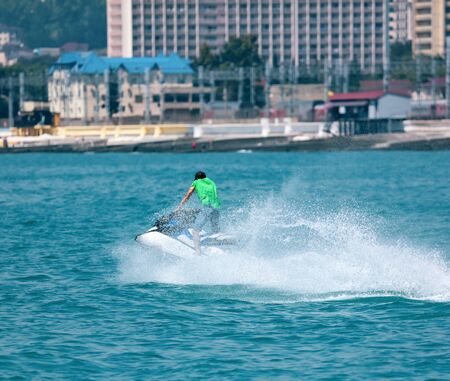 Racing on the sea on a jet ski. Water attraction.