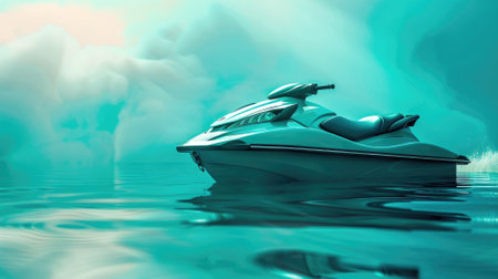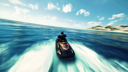 A dynamic scene depicting a person riding a jet ski across brilliant blue waters, with ocean spray and a picturesque coastline in the background.