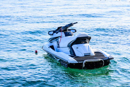 Limassol Cyprus June 10, 2020 Closeup of a jet skI, a type of personal watercraft used mainly for recreation, parked at a water sport place on Limassol beach in Cyprus Island