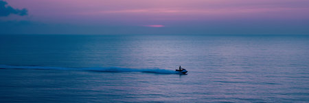 Sunset Jet Ski Rider on Calm Ocean Waters Against Purple Sky.