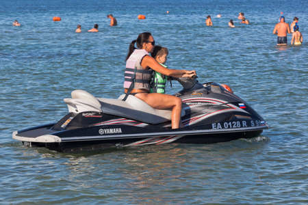 Zaozyornoye, Evpatoria, Crimea, Russia - July 23, 2020: Mom and child go to ride a jet ski near the Barabulka beach in the resort village of Zaozyornoye, Evpatoria, Crimea