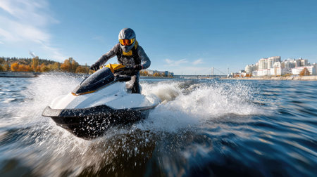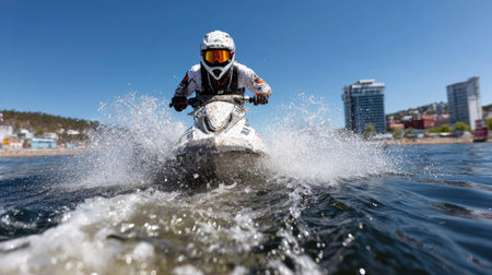 Experience the thrill of jet skiing on a sunny day, capturing the action of a rider speeding across the clear waters near a coastal city.