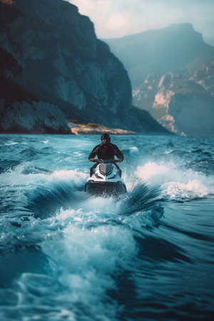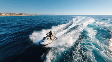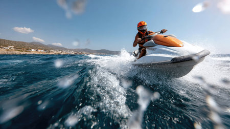 Experience the exhilaration of jet skiing over crystal-clear ocean waves under the warm sun, showcasing an adventurous spirit by the beautiful coastline.