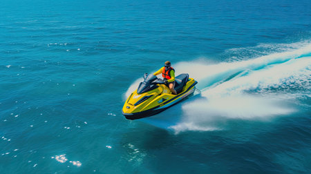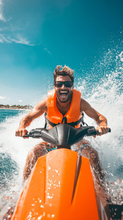 Tourist enjoying extreme water activity on a jet ski, making a splash in the turquoise ocean on a sunny summer day