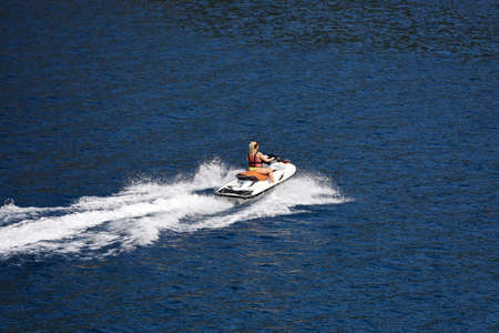 Blonde woman in life vest rides a water scooter on the sea. Water sport in summer, riding a hydro cycle