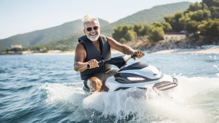 Senior bearded Man on Jet Ski, Tropical Ocean, Vacation Concept