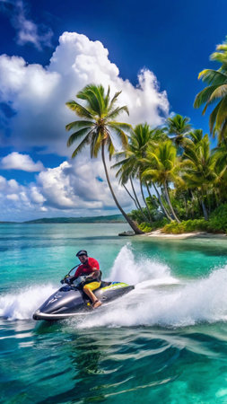 Thrilling jet ski ride over shimmering blue ocean waters, capturing the essence of adventure and freedom against a backdrop of lush tropical beauty.